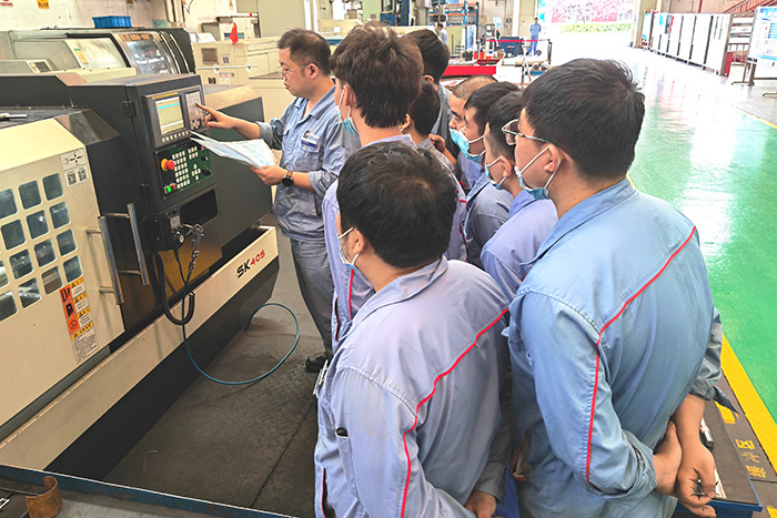 佳電股份技師、屏蔽車間數(shù)控車工吳先聞在數(shù)控車床前,有針對性地圍繞識圖基礎(chǔ)、刀具選擇,數(shù)控刀具涂層材料區(qū)別以及切削用量等方面進行實操培訓(xùn),并對操作過程中的常見問題進行分析講解,促進產(chǎn)品質(zhì)量和生產(chǎn)效率提高。