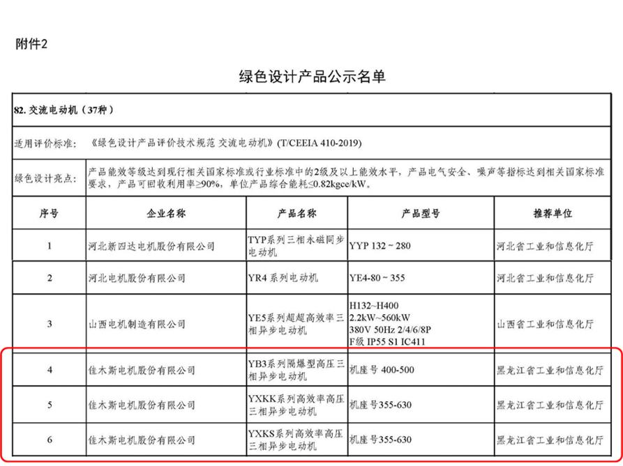 2021年12月, 3個系列高壓電機(jī)產(chǎn)品獲得國家“綠色設(shè)計(jì)產(chǎn)品”稱號,IE5系列電機(jī)機(jī)企業(yè)產(chǎn)品標(biāo)準(zhǔn)獲得國家企業(yè)標(biāo)準(zhǔn)“領(lǐng)跑者”稱號,該標(biāo)準(zhǔn)中規(guī)定的效率是目前國內(nèi)最高效節(jié)能隔爆型異步電動機(jī)產(chǎn)品,效率值超過最新的國家能效標(biāo)準(zhǔn)1級指標(biāo)要求。受此認(rèn)證,佳電股份將被納入萬家用能單位的采購?fù)扑]名單,作為綠色電動機(jī)產(chǎn)品被鼓勵優(yōu)先采購。