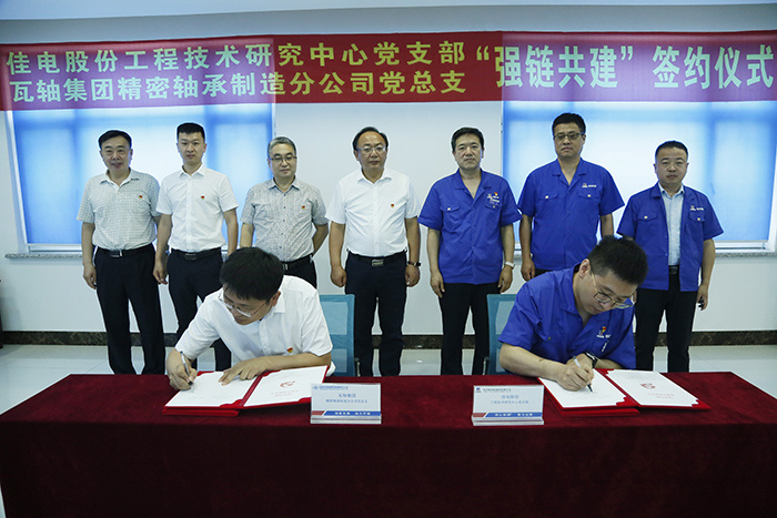為深入貫徹落實(shí)哈電集團(tuán)“三級(jí)書記抓質(zhì)量”工作要求,深入開展“強(qiáng)黨性 精技術(shù) 提質(zhì)量 優(yōu)服務(wù)”主題黨日系列活動(dòng),積極向供應(yīng)鏈延伸加大黨建共建力度,以黨建引領(lǐng)促進(jìn)技術(shù)水平和產(chǎn)品質(zhì)量提升,近日,哈電集團(tuán)佳電股份工程技術(shù)研究中心黨支部與瓦房店軸承集團(tuán)精密軸承制造分公司黨總支開展以“強(qiáng)鏈共建”為主題的聯(lián)建共建活動(dòng)。并簽訂黨建共建協(xié)議。佳電股份黨委副書記劉漢成、瓦軸集團(tuán)黨委副書記孫世成出席簽約儀式。瓦軸集團(tuán)代表在公司領(lǐng)導(dǎo)陪同下參觀了企業(yè)展廳和生產(chǎn)車間。