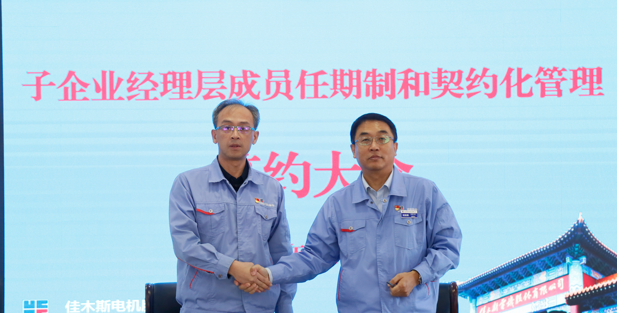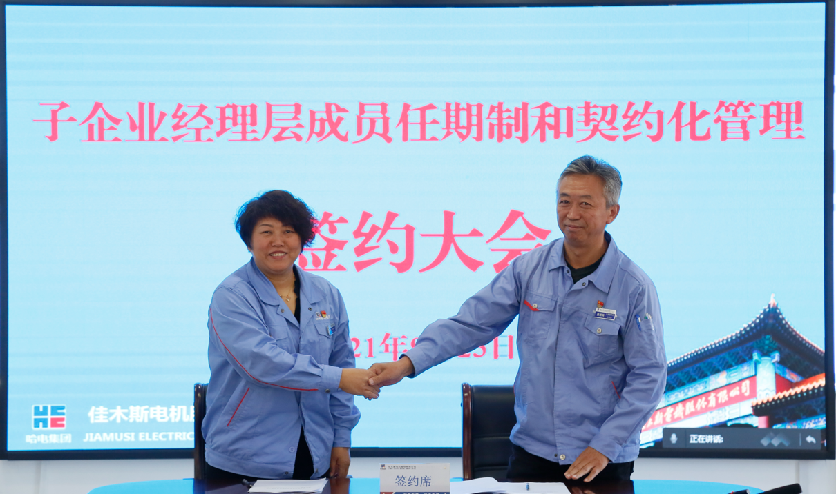 為深入落實國企改革三年行動方案,貫徹哈電集團關(guān)于子企業(yè)推行經(jīng)理層成員任期和契約化管理工作部署,確?!笆奈濉蹦繕巳蝿?wù)落實落地。9月23日,佳電股份子企業(yè)經(jīng)理層成員任期制和契約化管理簽約大會在佳木斯、哈爾濱、蘇州和成都以視頻形式舉行。佳電股份董事長、黨委書記劉清勇出席會議并講話。佳電公司、成都佳電、蘇州佳電、吉林佳電、運維科技五家子企業(yè)經(jīng)理層成員分別簽署了《崗位聘任協(xié)議書》和《經(jīng)營業(yè)績責(zé)任書》。