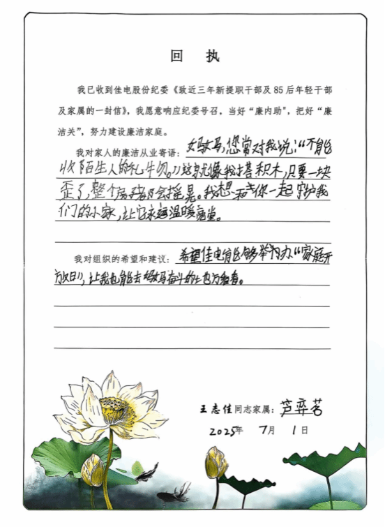 佳電股份將廉潔教育觸角延伸至“家庭”陣地,向近三年新提職干部、85后年輕干部及其家屬同步發(fā)放《家庭助廉倡議書(shū)》與《給年輕干部提個(gè)醒》廉潔讀本。倡議書(shū)中既有黨紀(jì)法規(guī)解讀,又含溫情寄語(yǔ),旨在以家庭“小港灣”筑牢企業(yè)“大防線”。活動(dòng)中,黨員干部與家屬共同研讀、深刻感悟,家屬們紛紛回信,字里行間滿是“廉潔齊家”的囑托與“慎終如始”的期許,讓清廉家風(fēng)在企業(yè)中傳遞。