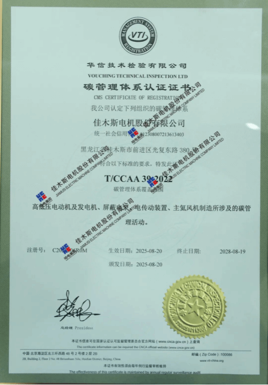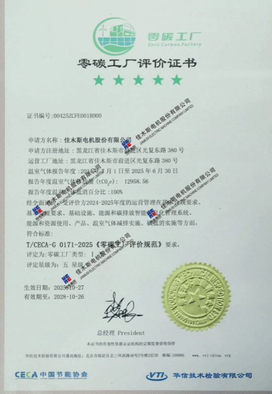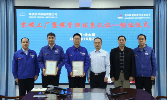 10月27日,華信技術(shù)檢驗(yàn)有限公司在哈電集團(tuán)佳木斯電機(jī)股份有限公司(以下簡(jiǎn)稱(chēng)“佳電股份”)舉行零碳工廠(chǎng)暨碳管理體系認(rèn)證頒證儀式,佳電股份獲評(píng)《碳管理體系認(rèn)證證書(shū)》與《零碳工廠(chǎng)評(píng)價(jià)證書(shū)》,成為國(guó)內(nèi)電機(jī)行業(yè)首家通過(guò)《零碳工廠(chǎng)評(píng)價(jià)規(guī)范》新標(biāo)準(zhǔn)認(rèn)證的企業(yè),標(biāo)志著佳電股份在高端化、智能化、綠色化發(fā)展道路上邁出的關(guān)鍵一步。