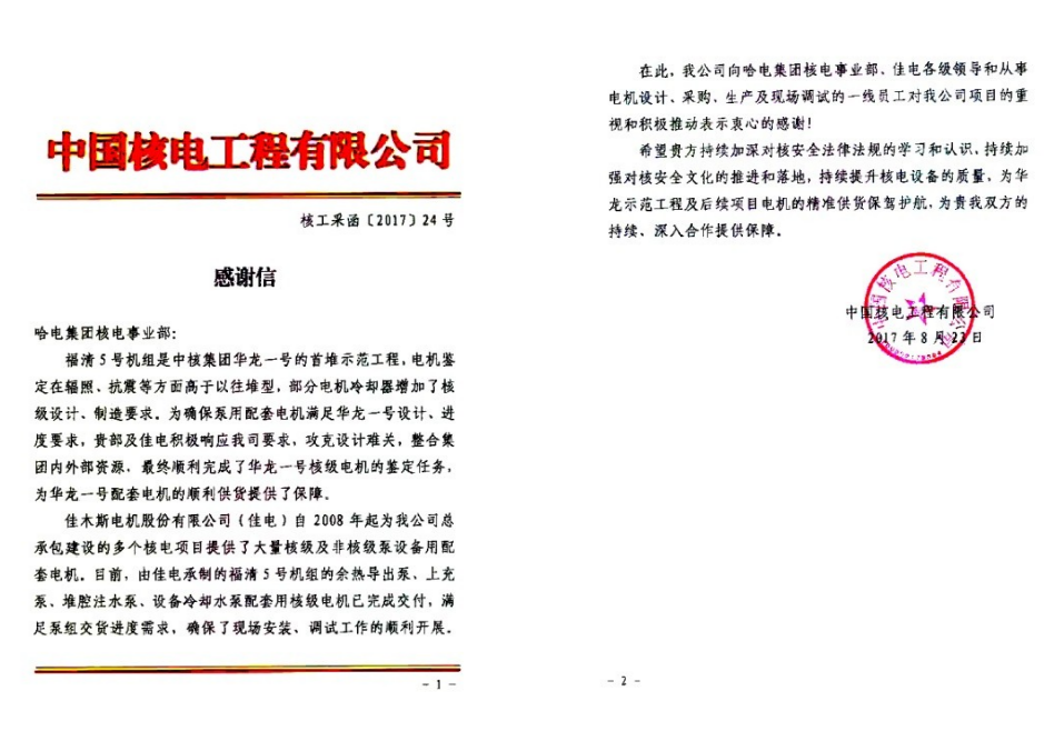2021年1月30日,伴隨著全球第一臺“華龍一號”核電機(jī)組——中核集團(tuán)福建福清核電站5號機(jī)組投入商業(yè)運行,標(biāo)志著我國三代核電技術(shù)領(lǐng)域躋身世界前列。 作為我國第一家取得國家核安全局頒發(fā)的1E級電機(jī)設(shè)計、制造許可證單位,...